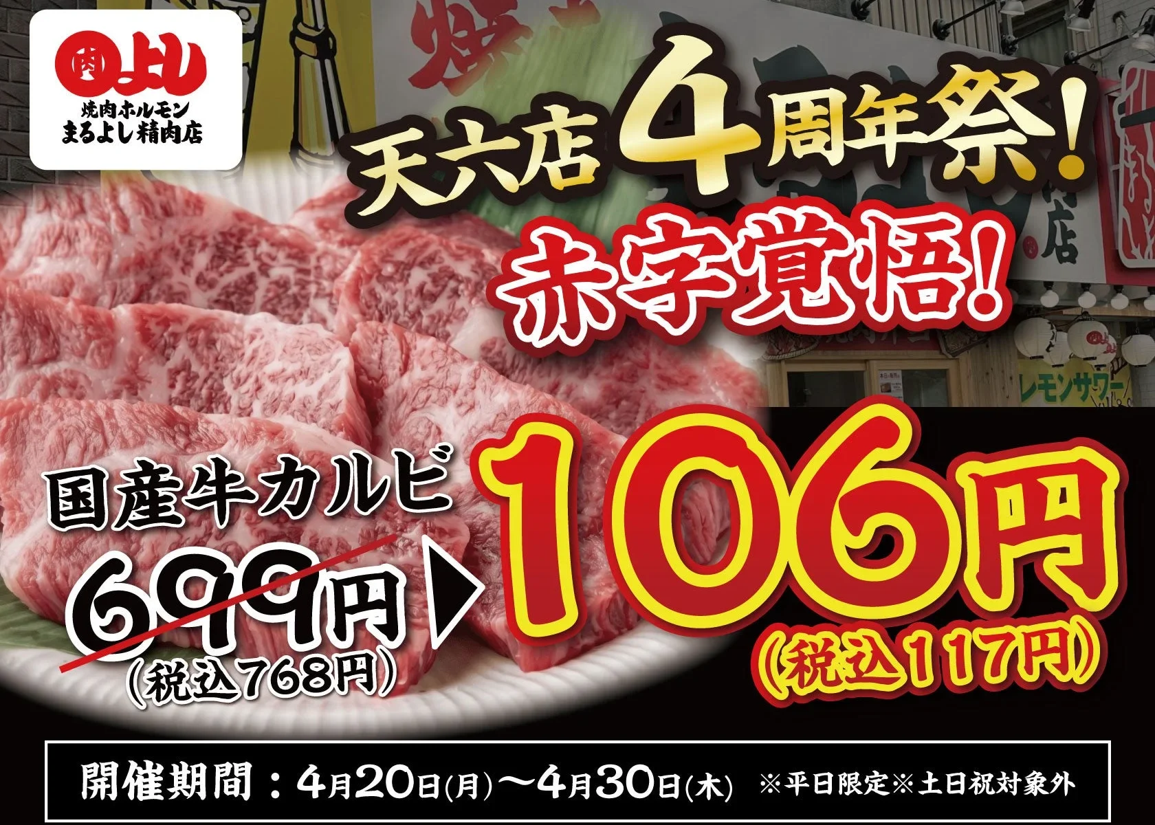 天六店4周年祭!国産牛カルビが驚きの106円で登場!
