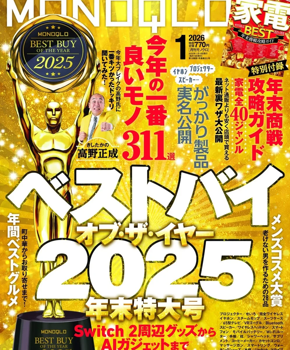 『MONOQLO』2026年1月号が11月19日に発売されました!今回の1月号は、毎年恒例の「ベストバイ オブ・ザ・イヤー2025」を大特集。ガジェットから生活家電まで、年末の買い物納めに役立つ情報が満載です。