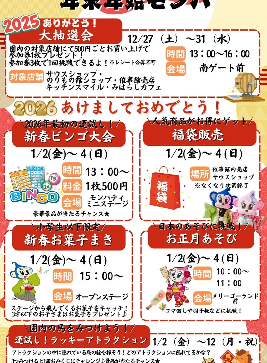 2026年の干支「午」にちなんで、園内のアトラクションに隠された馬の絵を探してスタンプを集めるゲームです。3つ見つけると、おみくじに1回チャレンジできますよ!