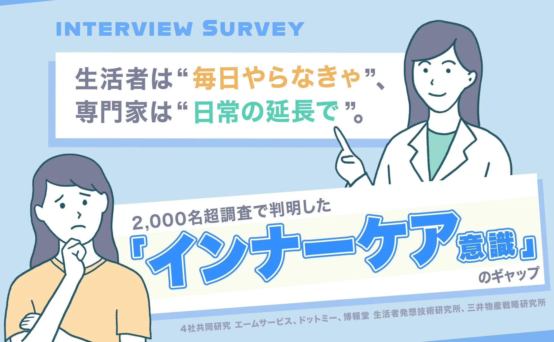 株式会社ドットミー、株式会社三井物産戦略研究所、株式会社博報堂 生活者発想技術研究所、エームサービス株式会社の4社は、インナーケアをもっと気軽に、そして無理なく続けられる習慣にするためのヒントを探るべく、この「インナーケアに関する意識調査」を共同で実施しました。