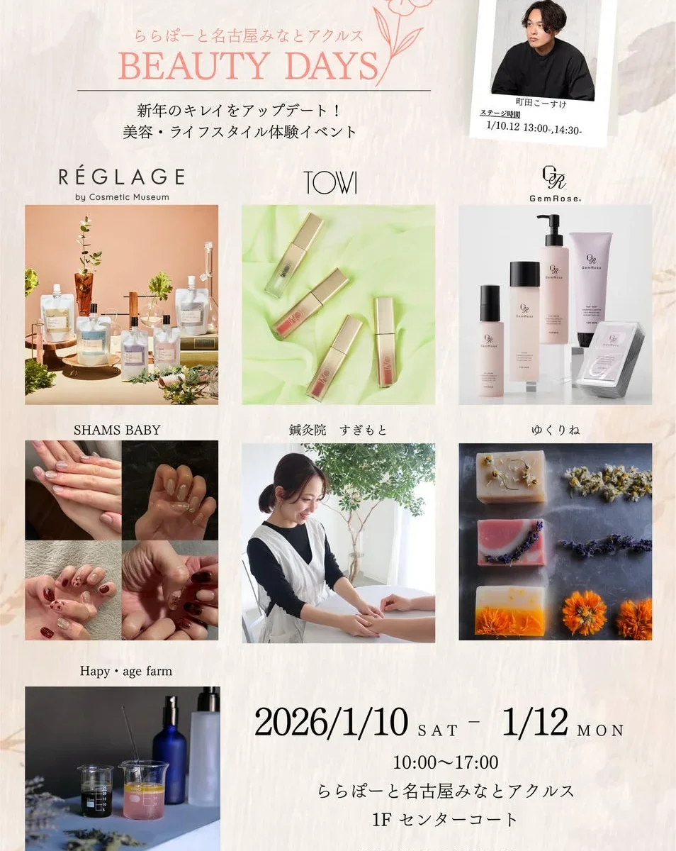 2026年1月10日(土)から12日(月・祝)の3日間、三井ショッピングパーク ららぽーと名古屋みなとアクルスで、美容とライフスタイルに特化した体験型イベント「ららぽーと名古屋みなとアクルス BEAUTY DAYS」が開催されます。