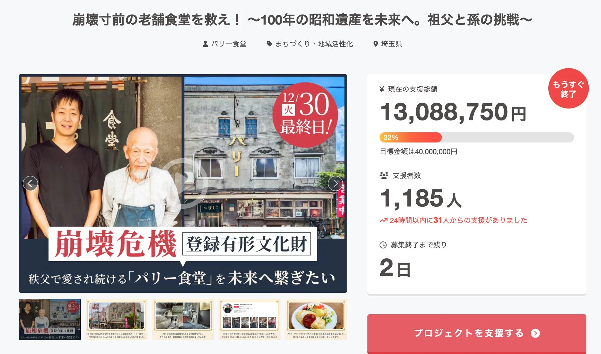 秩父で約100年の歴史を誇る老舗「パリー食堂」が、店舗の耐震工事費用を募るクラウドファンディングを実施中です。2025年12月28日現在、支援総額は1,300万円を突破し、1,000人以上の方々から温かい支援が寄せられています。しかし、目標金額4,000万円にはまだ届いておらず、クラウドファンディングの終了は12月30日と、残り2日という状況です。