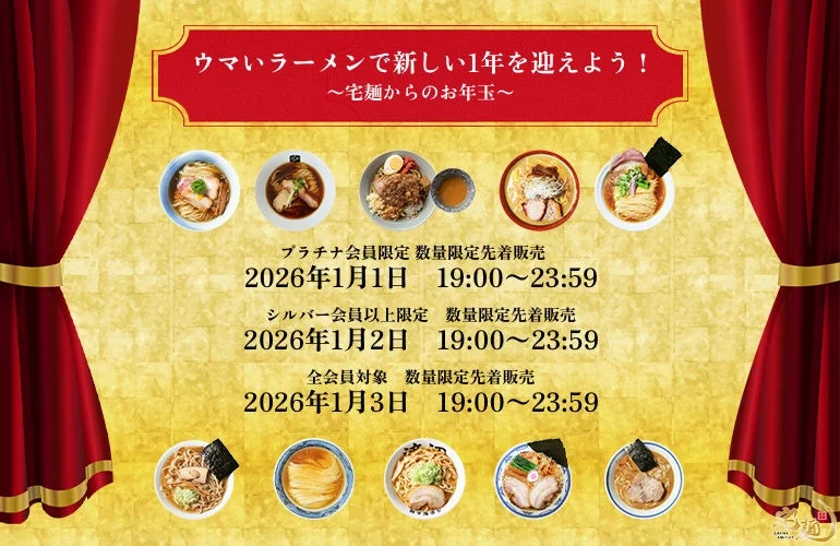 「宅麺.com」では、2025年12月29日(月)午後12時から、年末年始恒例の「宅麺お年玉イベント」がスタートします!全国の有名店や人気店、注目のお店から選りすぐりのラーメン・つけ麺が勢ぞろいするこの特別企画で、新年を美味しい一杯で迎えてみませんか?