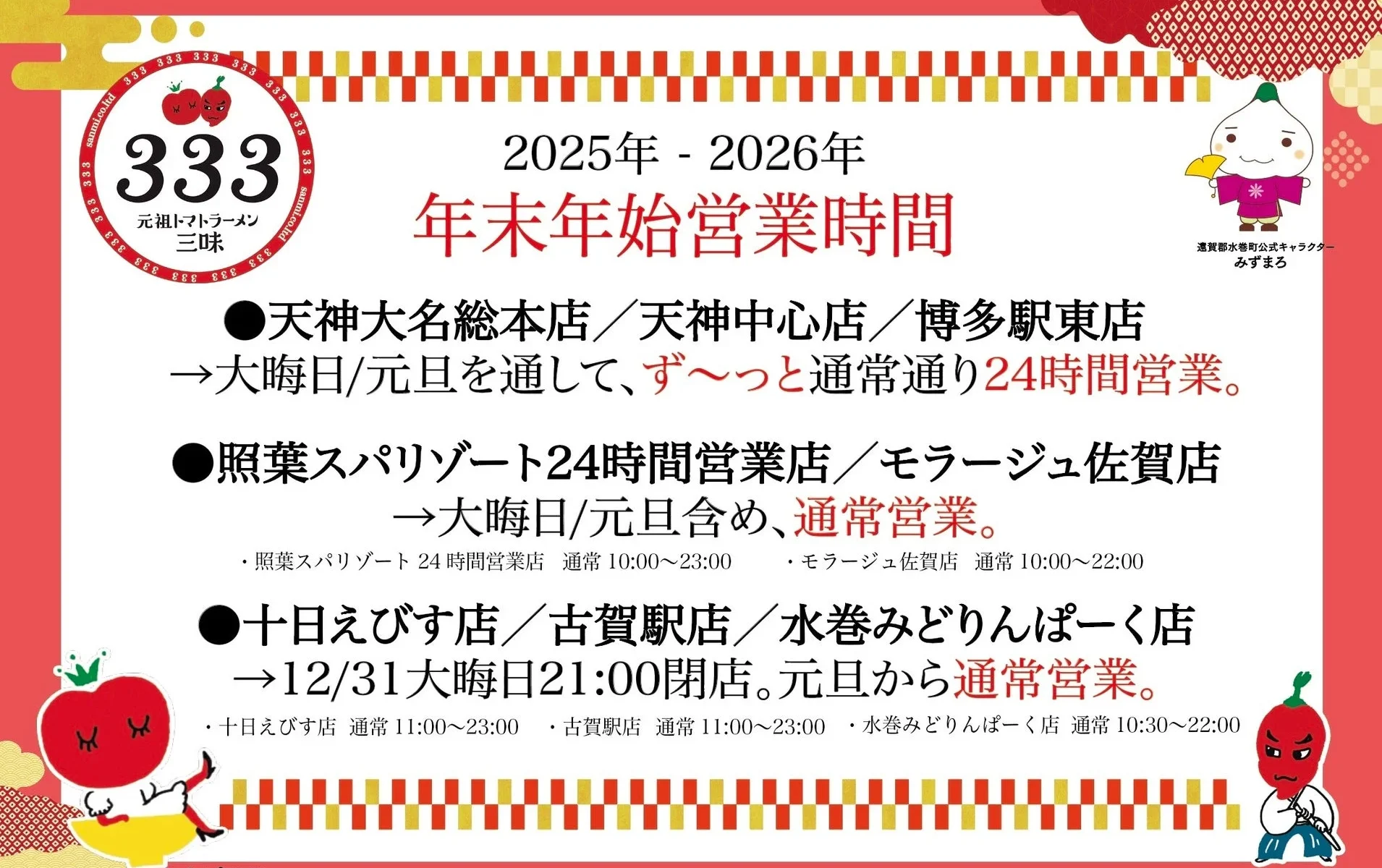 福岡発祥の「元祖トマトラーメンと辛麺と元祖トマトもつ鍋 三味(333)」が、2025年12月24日と25日に全8店舗で実施した「タダクリスマス」キャンペーンで大きな反響を呼びました。