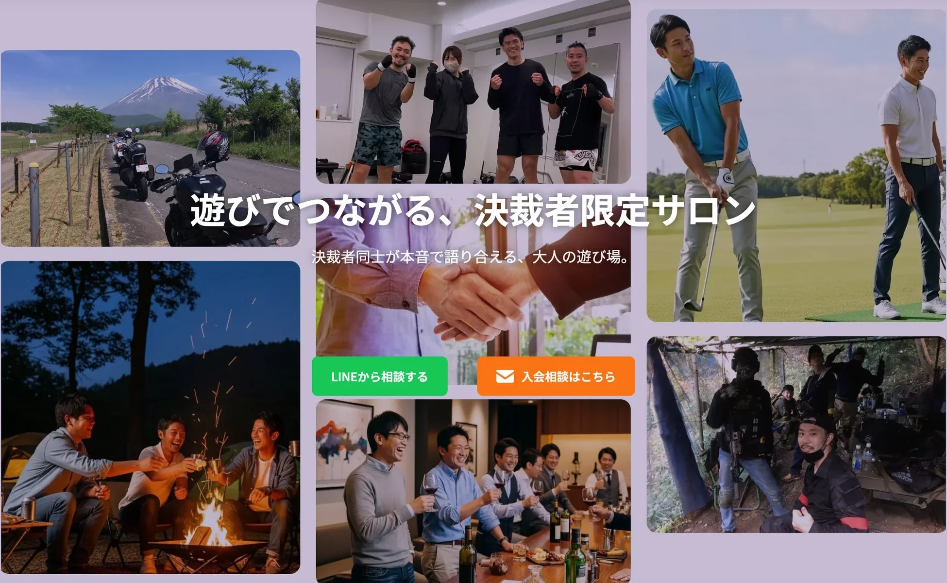 「好き」で繋がれる: キャンプ、車、バイク、スナック貸切、ワイン会、カジノバー、サバゲーなど、多様な「遊び」イベントを通じて距離を縮めます。営業目的の交流会とは異なり、純粋に楽しめる関係性を築けます。