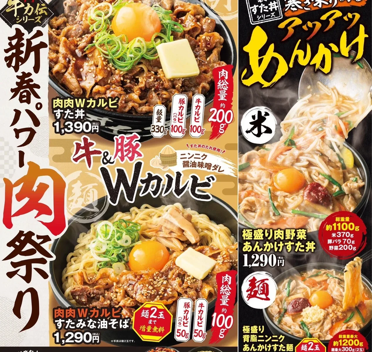 今回の新商品は、「肉を主役」にした「牛力伝シリーズ」と、「公式なのに裏」というコンセプトで長年愛されるすた丼を大胆にアレンジした「裏すた丼シリーズ」のW主役!肉量約200gの焼肉系メニューと、総重量1kg超えのあんかけメニューで、年始の活力をがっつり後押ししてくれますよ。