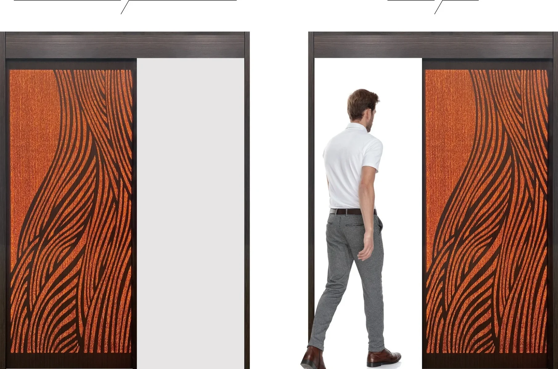 特徴: 室内向け木製スライディング自動扉、光と音声で空間体験を演出