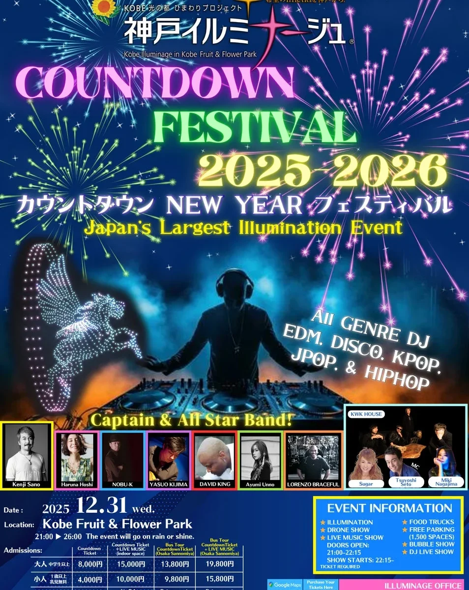 15周年を迎える神戸イルミナージュを締めくくるこのイベントは、イルミネーションと音楽、そして多彩なショーコンテンツを組み合わせた“体験型カウントダウン”がテーマ。夜空を彩るドローンショーや迫力満点のバブルショー、ライブステージやDJタイムなど、世代を問わずみんなで盛り上がれる内容となっているんだ。