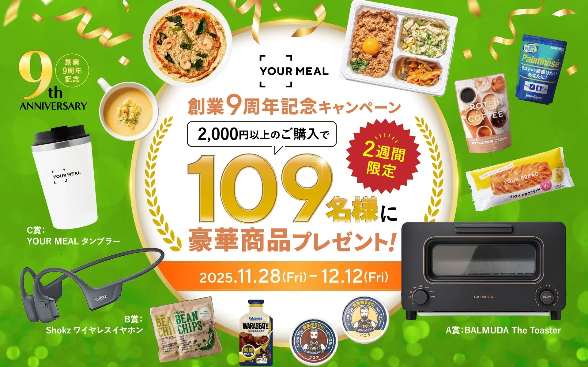 YOUR MEALは、2025年11月29日に創業9周年を迎えます。これを記念して、11月28日から12月12日までの期間中、2,000円以上の購入者を対象に、抽選で109名に豪華景品が当たるキャンペーンを実施します。