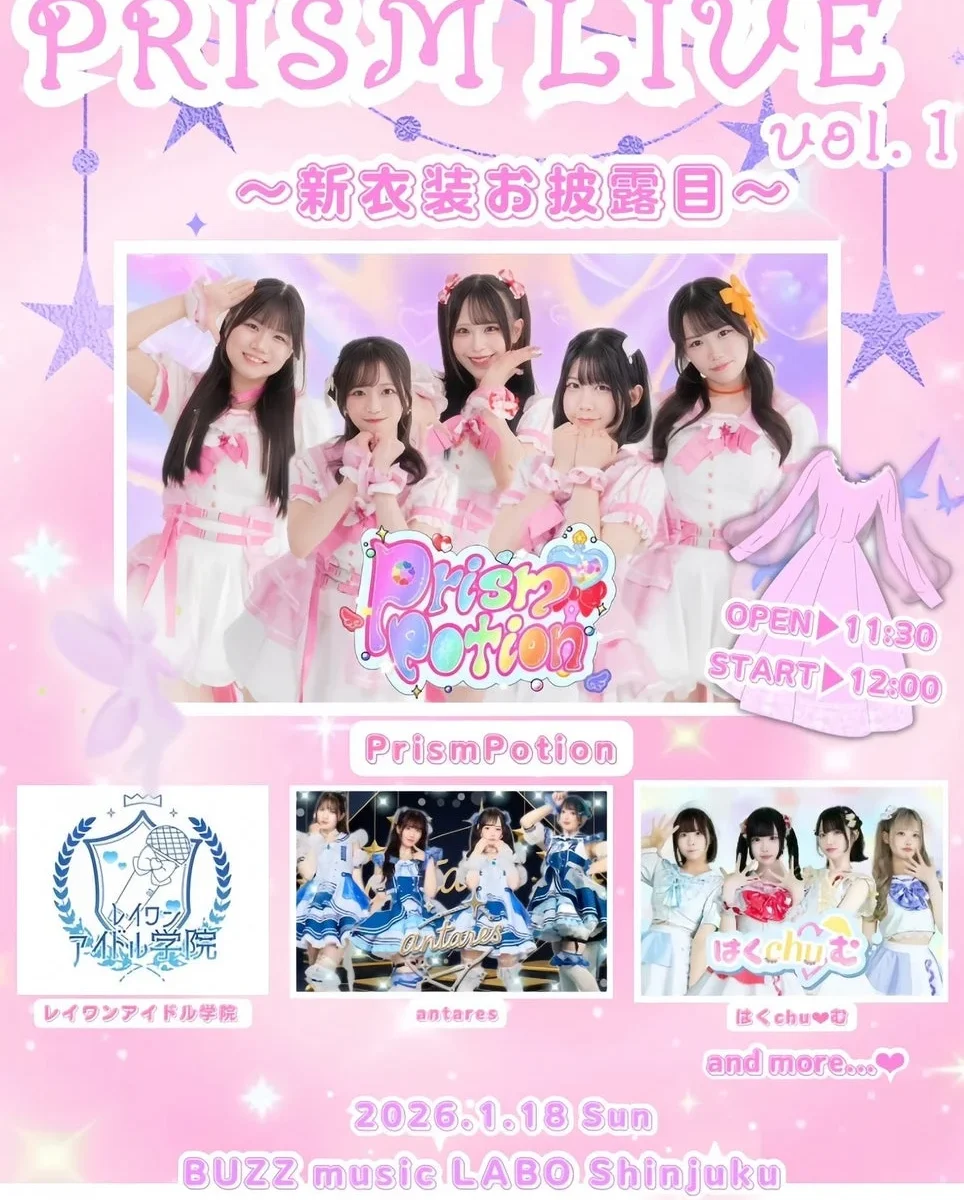 「♡プリズムの煌めきと魔法のお薬♡」をコンセプトに活動するアイドルグループ、PrismPotion(プリズムポーション)が、なんと初の主催ライブ「PRISM LIVE vol.1 〜新衣装お披露目〜」を開催しちゃいます!2026年1月18日(日)にBUZZ music LABO Shinjukuで行われるこの特別なライブでは、待望の新衣装お披露目だけでなく、Wonder Field所属のグループや豪華ゲストアイドルも集結するんですよ。