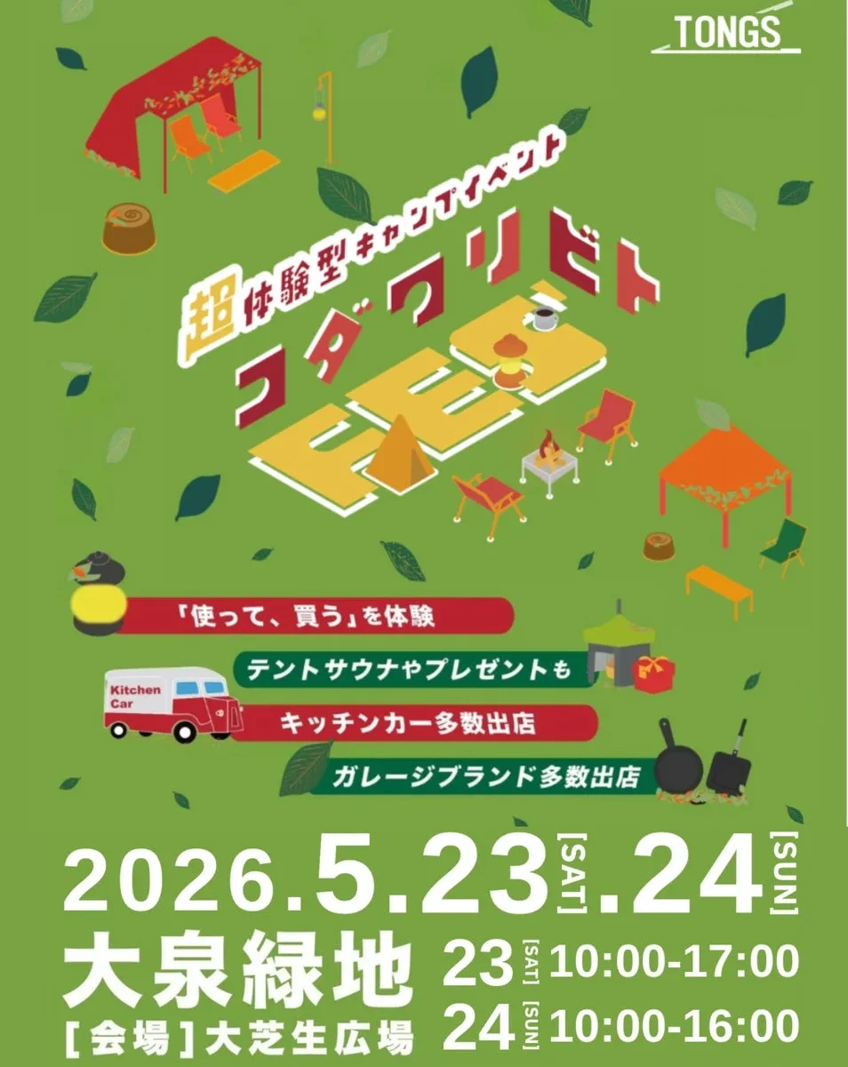 日本中のガレージブランドが集まる超体験型キャンプイベント『コダワリビトFES』が、2026年5月23日(土)・24日(日)の2日間、大阪府堺市の大泉緑地で復活開催されることになったよ!約1年ぶりの開催となる第4回目は、キャンプ好きはもちろん、アウトドア初心者や家族連れも大歓迎のイベントなんだ。