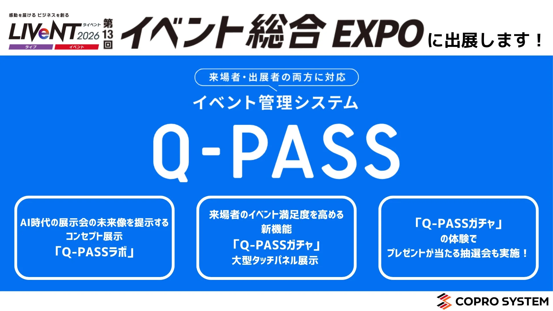 2026年1月21日(水)から23日(金)まで、幕張メッセで「イベント総合EXPO 2026」が開催されます。この展示会に、株式会社コプロシステムがイベント管理システム「Q-PASS」を出展し、イベントのDXを加速させる新たな体験を紹介します。