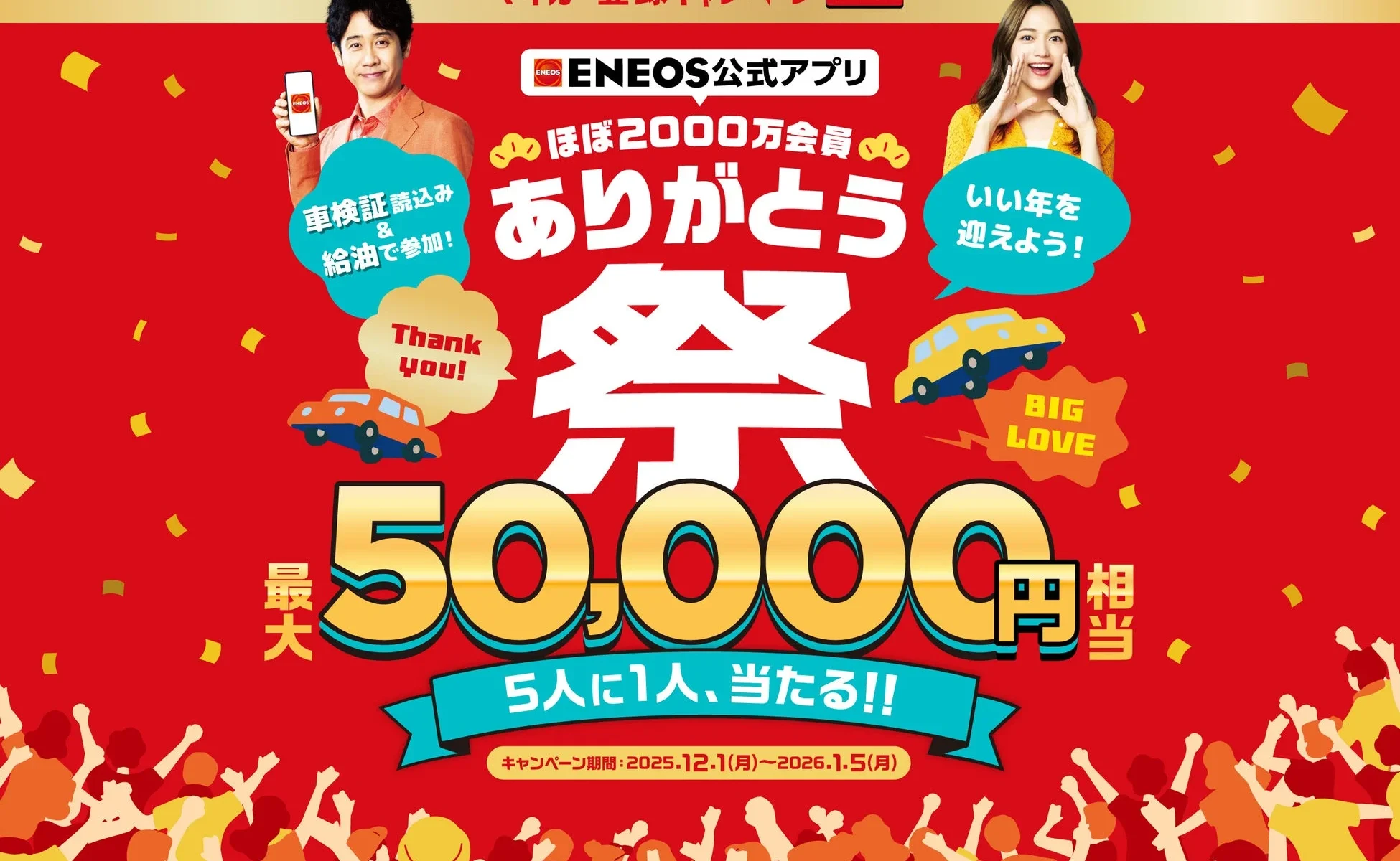 ENEOS公式アプリが、まもなく会員数2,000万ユーザーに到達する見込みです!これを記念して、日頃の感謝を込めた「ENEOS公式アプリ ほぼ2000万会員 ありがとう祭」が開催されます。最大50,000円相当²の「えらべるPay」が当たるこのチャンス、年末年始のお出かけついでにぜひ参加してみてはいかがでしょうか。