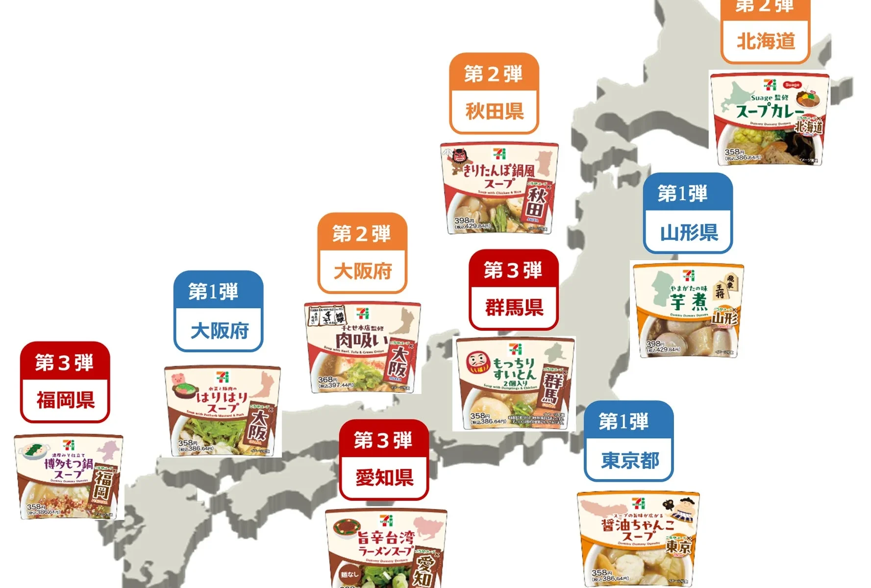 セブン-イレブンでは、現地に行かなくても手軽に日本各地のご当地名物を楽しめる「スープの祭典『日本横断!ご当地スープ巡り』」を開催しています。