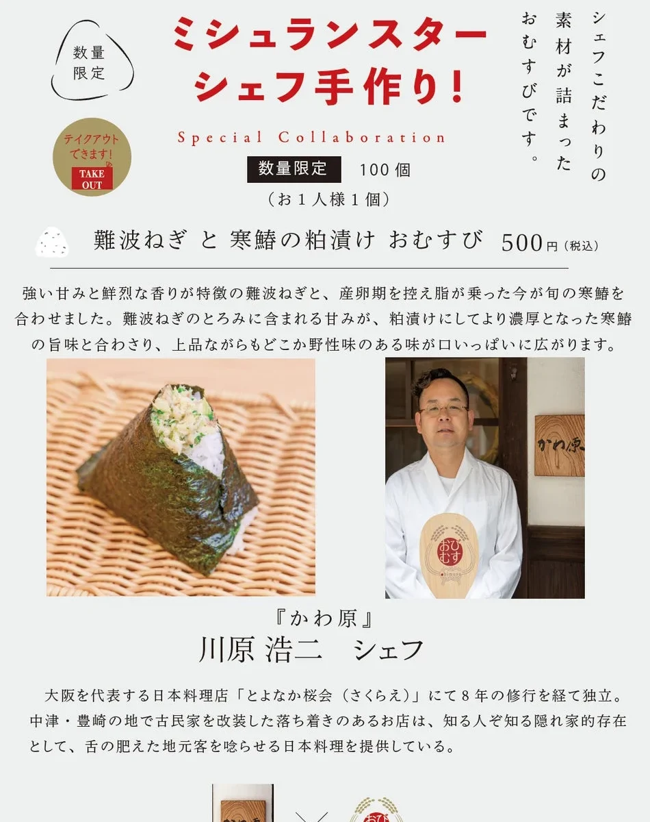この特別な「難波ねぎと寒鰆の粕漬けおむすび」は、ワンコインの500円(税込)で提供されます。ミシュランの味を気軽に楽しめる、またとないチャンスですね!