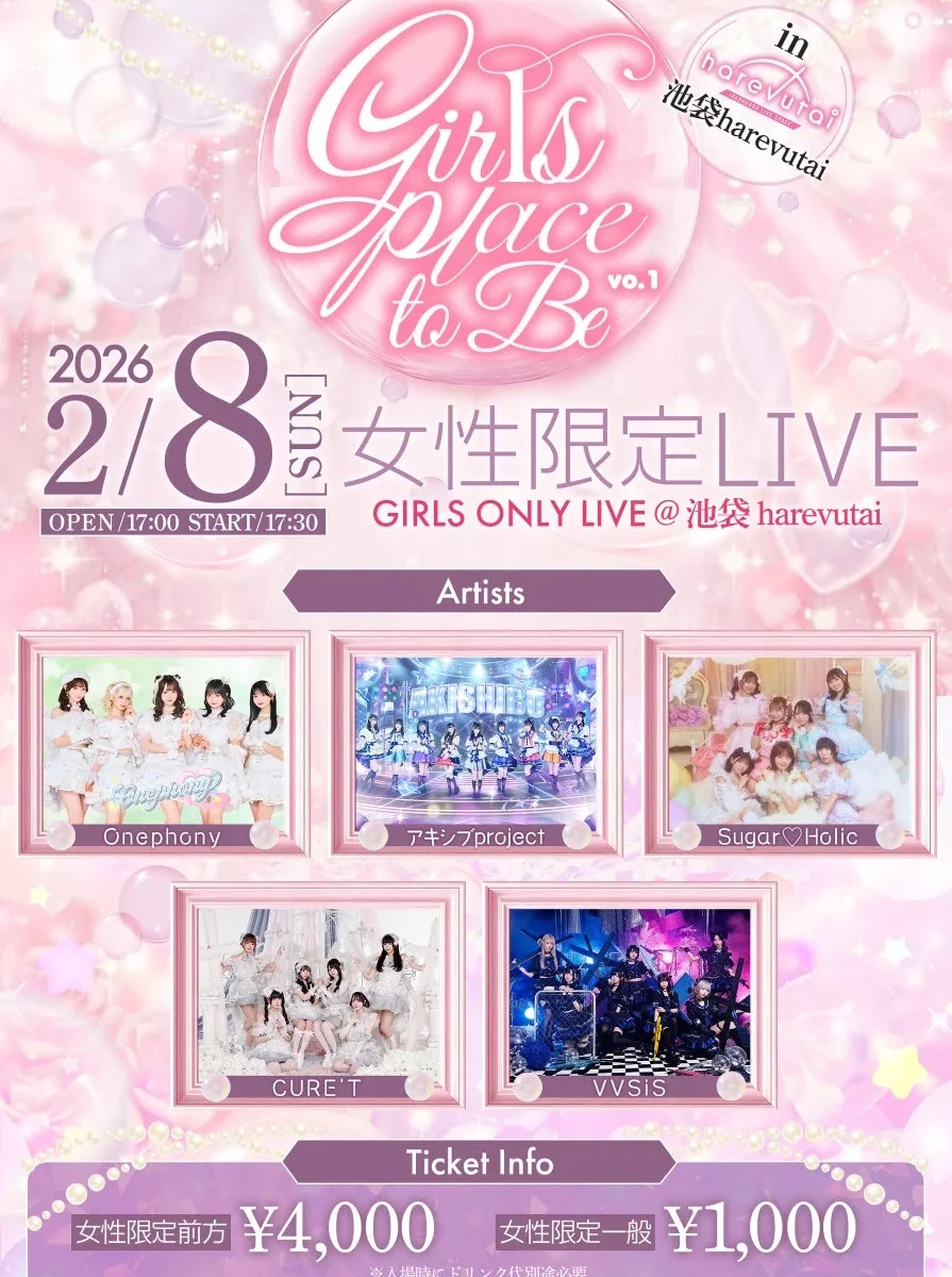 2026年2月8日(日)、池袋 harevutaiにて、女性限定アイドルライブイベント「Girls place to be. vol.1」が開催されることが発表されました。