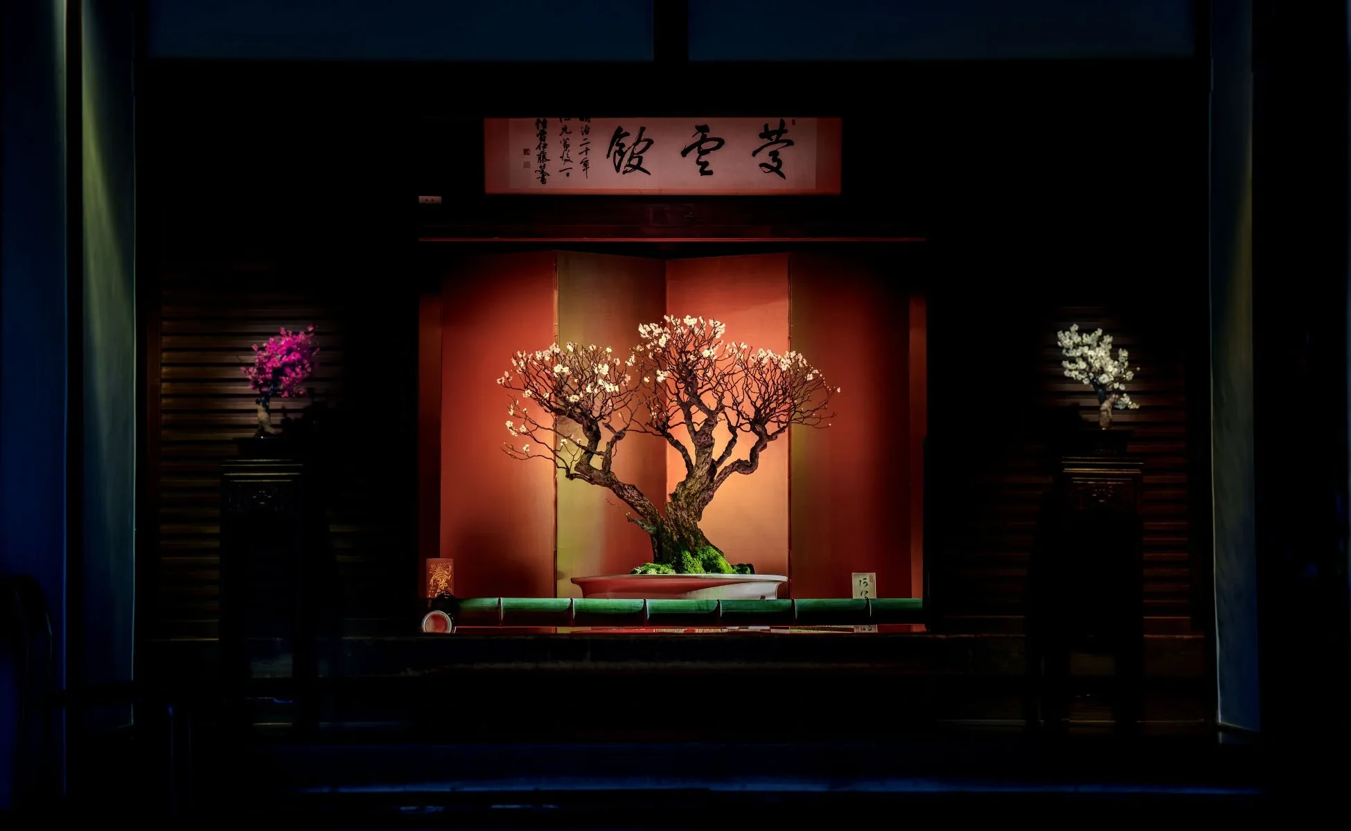 新館では、盆梅一つひとつをまるでアート作品のように魅せる展示演出が施されています。盆梅の造形美や生命力を、より間近で深く感じられる空間となっているので、ぜひ足を運んでみてください。