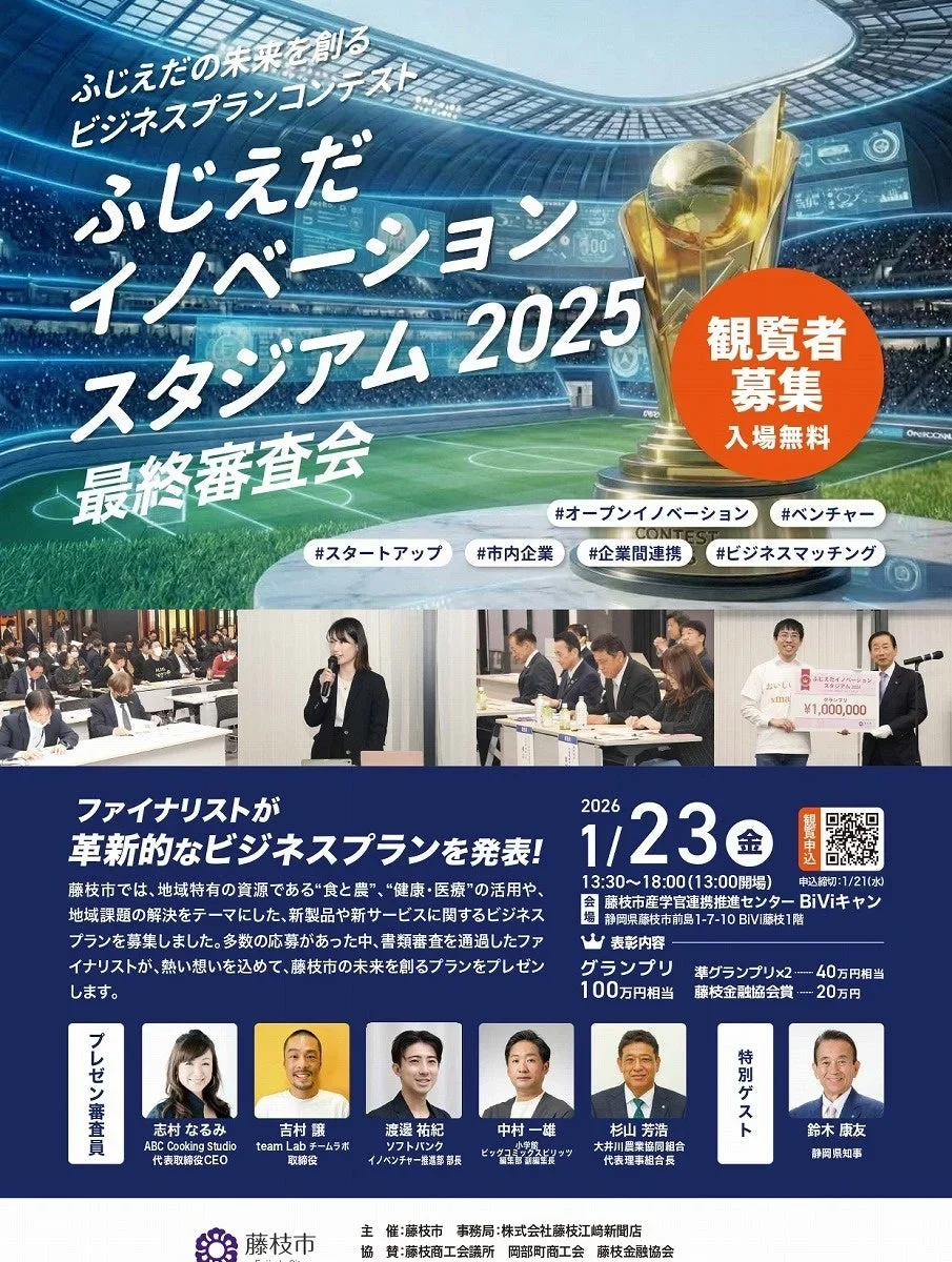 藤枝市の未来を形作るビジネスプランコンテスト「ふじえだイノベーションスタジアム2025」の最終審査会が、2026年1月23日(金)に開催されます。