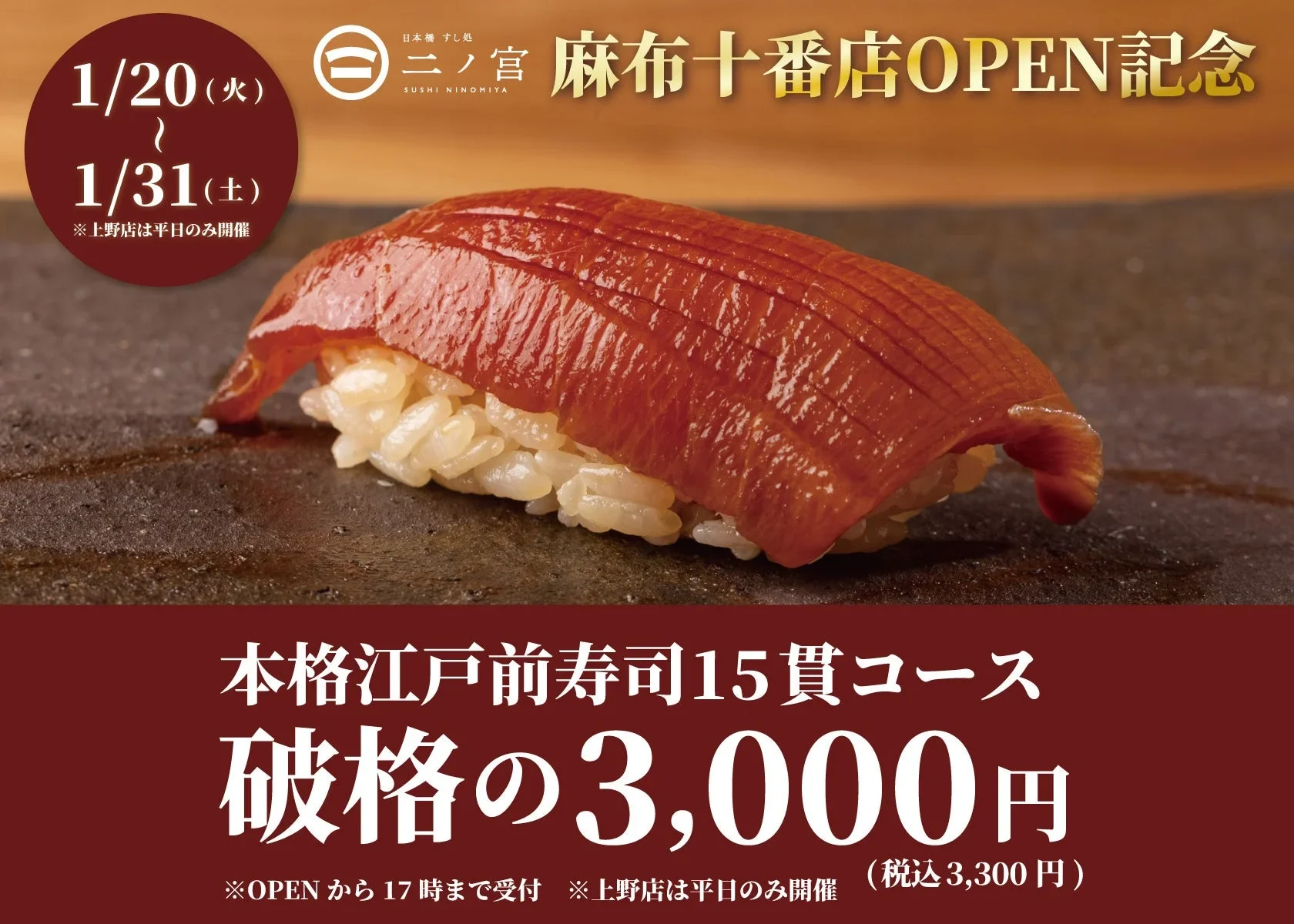 「日本橋すし処 二ノ宮」の麻布十番店がオープン!これを記念して、なんと本格江戸前寿司15貫コースが3,300円(税込)で楽しめる特別なキャンペーンが開催されます。