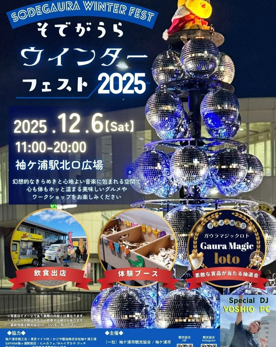 イベントの目玉の一つは、幻想的に輝くミラーボールツリーの展示です。そのきらめきに包まれながら、そでがうらアンバサダーでもあるSPECIAL DJ YOSHIO PC氏が選曲する心地よい音楽が会場を彩ります。おしゃれな雰囲気の中で、ゆったりとした時間を過ごせるでしょう。