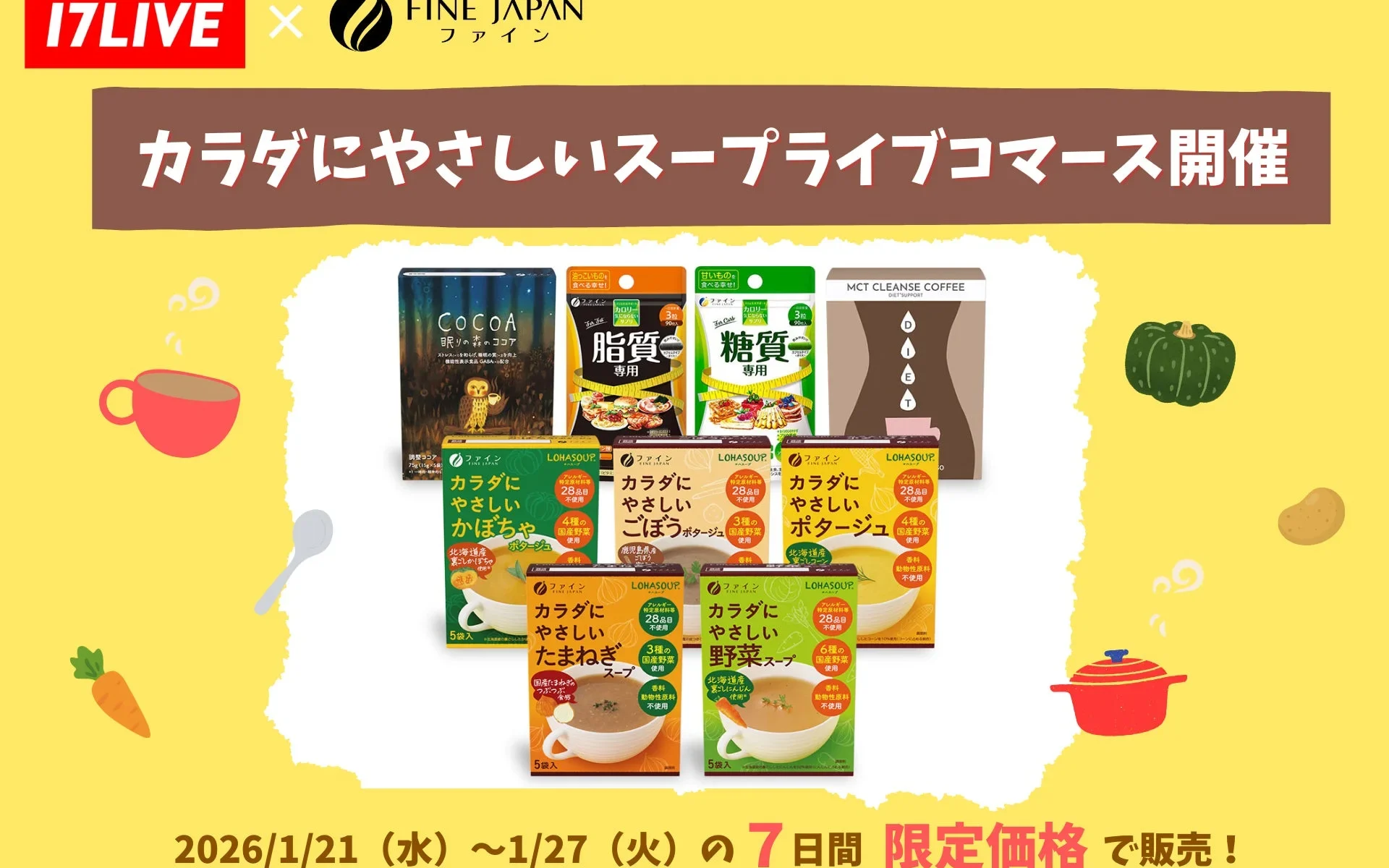 このイベントでは、ファインが自信を持って届ける「LOHASOUP カラダにやさしいシリーズ」や、話題の「眠りの森のココア」といった人気商品が、期間限定の特別セット&特別価格で販売されます。参加するイチナナライバーたちは、それぞれの言葉で商品の魅力を伝えながら、販売数を競うライブコマースバトルに挑戦!上位入賞者には豪華なプライズが用意されており、視聴者も応援することで、ライブならではの楽しさと健康的な生活サポートを同時に体験できます。
