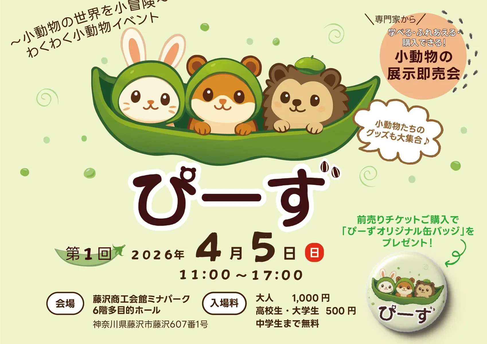 2026年4月5日(日)、神奈川県藤沢市の藤沢商工会館ミナパークにて、小動物の展示即売会「ぴーず」が初開催されます。ハムスター、うさぎ、ハリネズミといった人気の小動物たちが集まるこのイベントは、小動物と人、そして人と人がやさしくつながる場を目指しています。