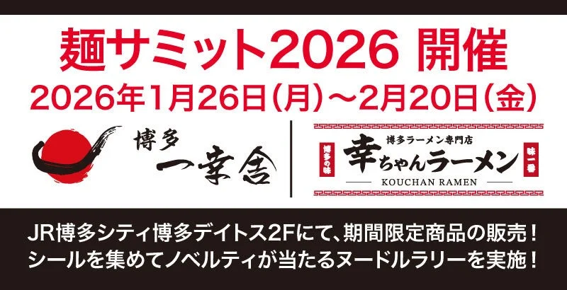 2026年1月26日(月)から、年に一度の麺の祭典【麺サミット2026】がJR博多シティでスタートします!このイベントには、世界中で愛されるラーメンブランド「博多一幸舎」と「幸ちゃんラーメン」が参加し、この期間でしか味わえない特別な限定商品を販売するとのことです。