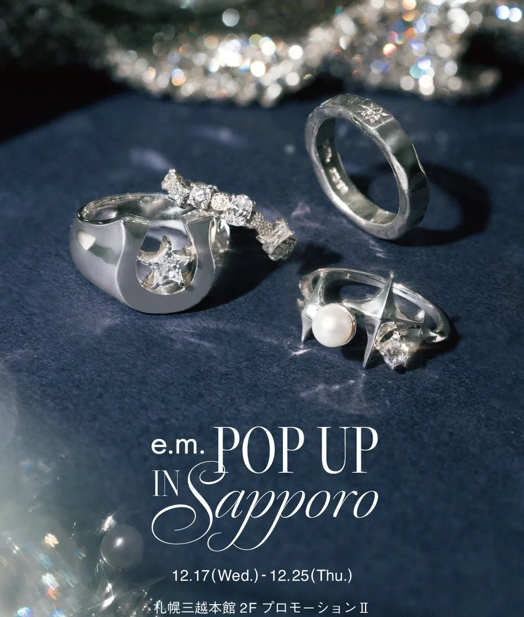 ジュエリーブランド「e.m.」が、2025年12月17日(水)から12月25日(木)までの9日間、札幌三越本館2FプロモーションIIにて期間限定POP UPイベントを開催します! 直営店舗がない北海道で毎年恒例となっているこのイベントは、HOLIDAYシーズンを彩る特別なジュエリーが勢ぞろいするチャンスです。自分へのご褒美や大切な人へのクリスマスギフトにぴったりのアイテムが見つかるでしょう。