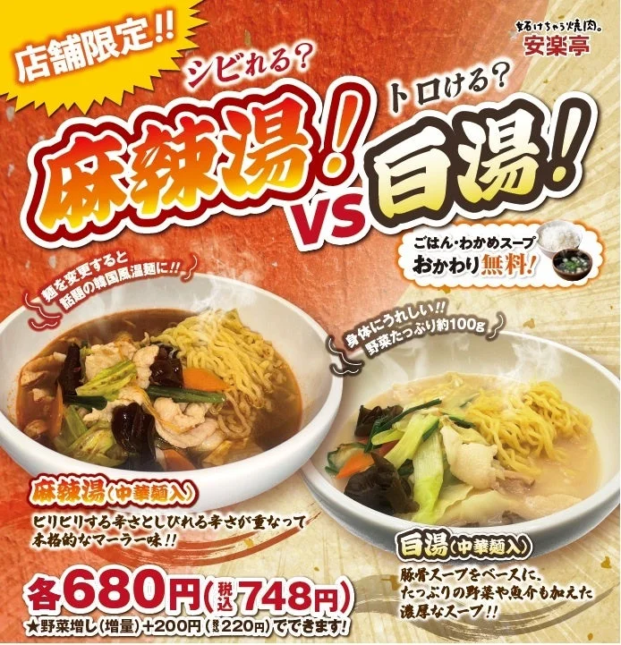 専門店のようだと評判の本格的な麻辣湯と濃厚白湯を、安楽亭の自然肉100%の美味しい焼肉と一緒に、ぜひこの機会に味わってみてください。
