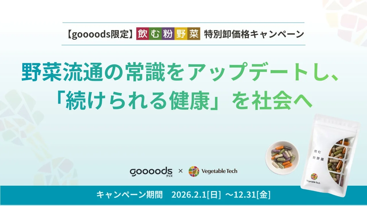ベジタブルテック株式会社と、卸売プラットフォーム「goooods(グッズ)」が協力し、国産野菜パウダー「飲む粉野菜」の特別卸価格割引キャンペーンをスタートしました!