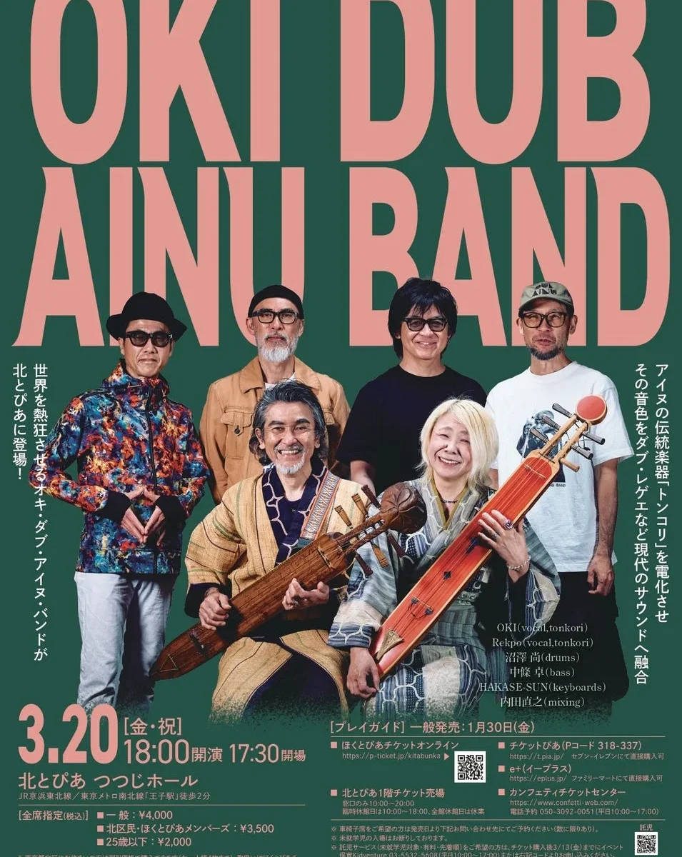 アイヌの伝統弦楽器「トンコリ」を現代のバンドサウンドに落とし込み、世界を熱狂させている「OKI DUB AINU BAND」のホール公演が決定したよ!2026年3月20日(金・祝)に北とぴあ つつじホール(東京都 北区 王子 1-11-1)で開催されるんだ。