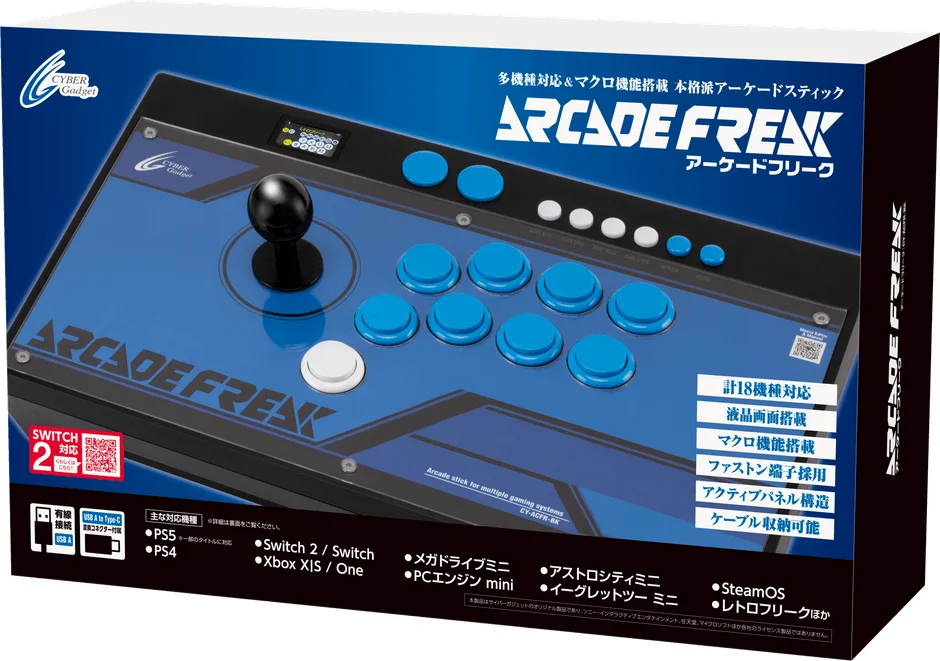 パソコンやPS5といった最新ハードはもちろん、メガドライブミニ、PCエンジン mini、レトロフリークなどの人気レトロゲーム機にも対応した、「18機種対応」のアーケードコントローラーです。さらに、最新機種・Nintendo Switch 2でも使用可能!現行からレトロまで、幅広いタイトルをこの1台で存分に楽しめます。