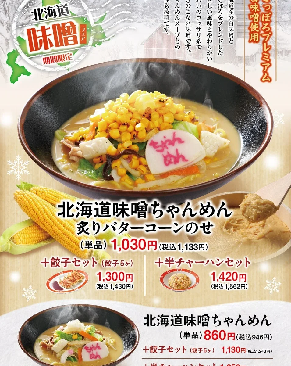 今回の限定メニューは、心も身体も温まる「北海道味噌ちゃんめん」と「北海道味噌ちゃんめん 炙りバターコーンのせ」の2種類。濃厚な北海道白味噌の味わいを存分に楽しめる一杯です。