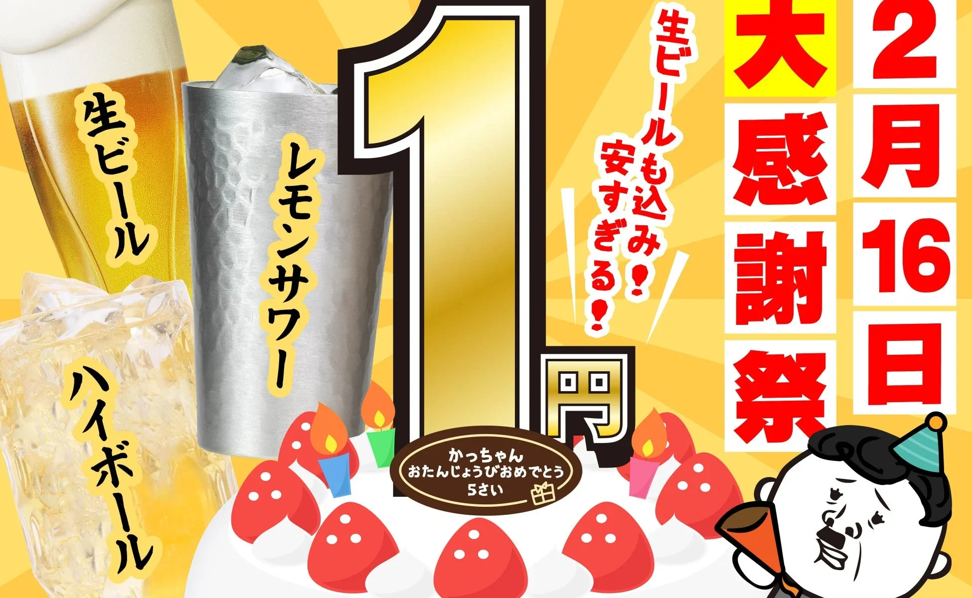 かっちゃん生誕祭!人気ドリンクが1円で楽しめるチャンス!