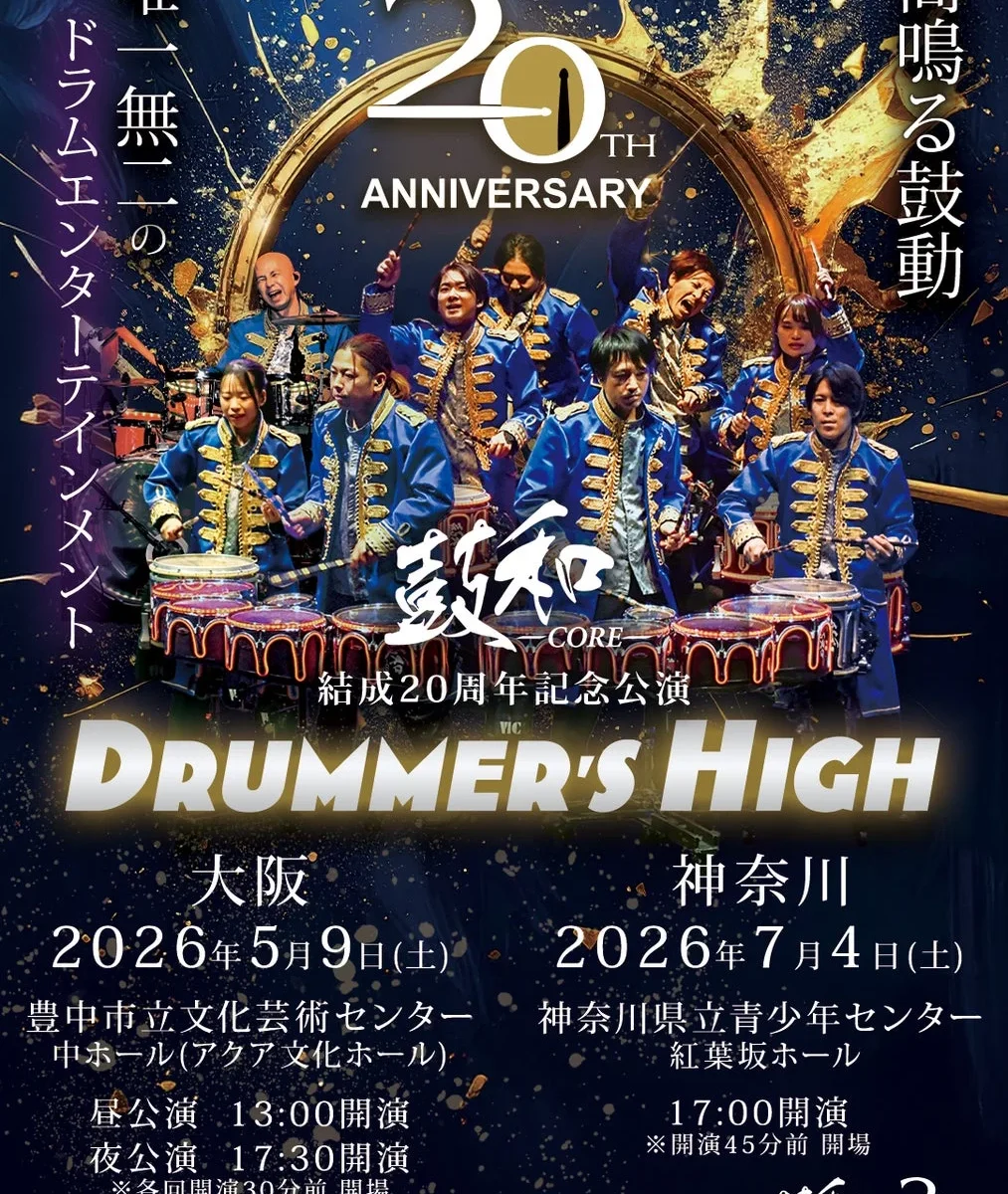 ドラムパフォーマンス集団「鼓和-CORE-」が、結成20周年を記念した特別公演「DRUMMER’S HIGH」を大阪と神奈川で開催します!マーチングドラムを主な表現手段とする彼らが、これまでの20年を“到達点”ではなく“出発点”と捉え、新たな挑戦に挑みます。今回の公演は「ドラム×テクノロジー」をテーマに、躍動感あふれるステージが期待できそうです。
