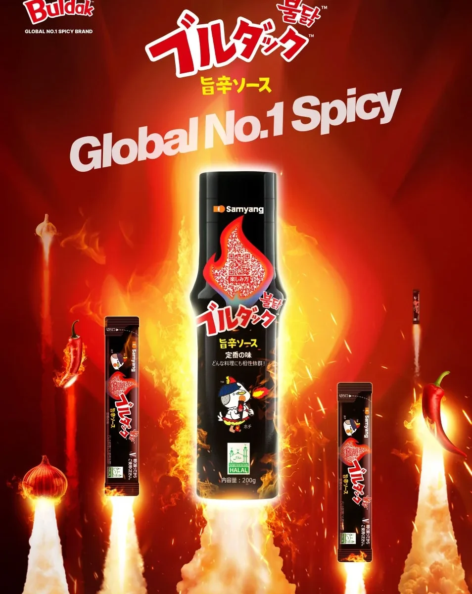 「ブルダック」は、韓国語で「辛い(ブル)鳥(ダック)」という意味。2012年に旨辛炒め麺としてブランドがスタートし、今では世界100カ国でインスタント麺、ソース、スナックなど、さまざまなカテゴリーで商品展開しているグローバルな辛味ブランドです。