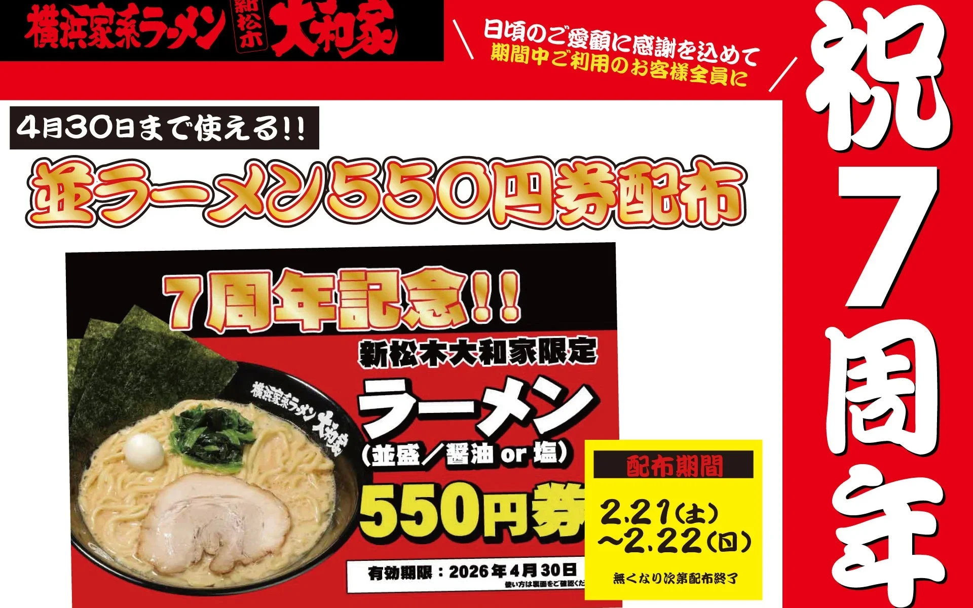 横浜家系ラーメン新松木大和家が、開店7周年を記念して、とってもお得な感謝祭を開催するよ!日頃の「ありがとう」を込めて、2026年2月21日(土)と22日(日)の2日間限定で、お店を利用したすべてのお客さんに「ラーメン550円券」がプレゼントされるんだ。これは見逃せないね!