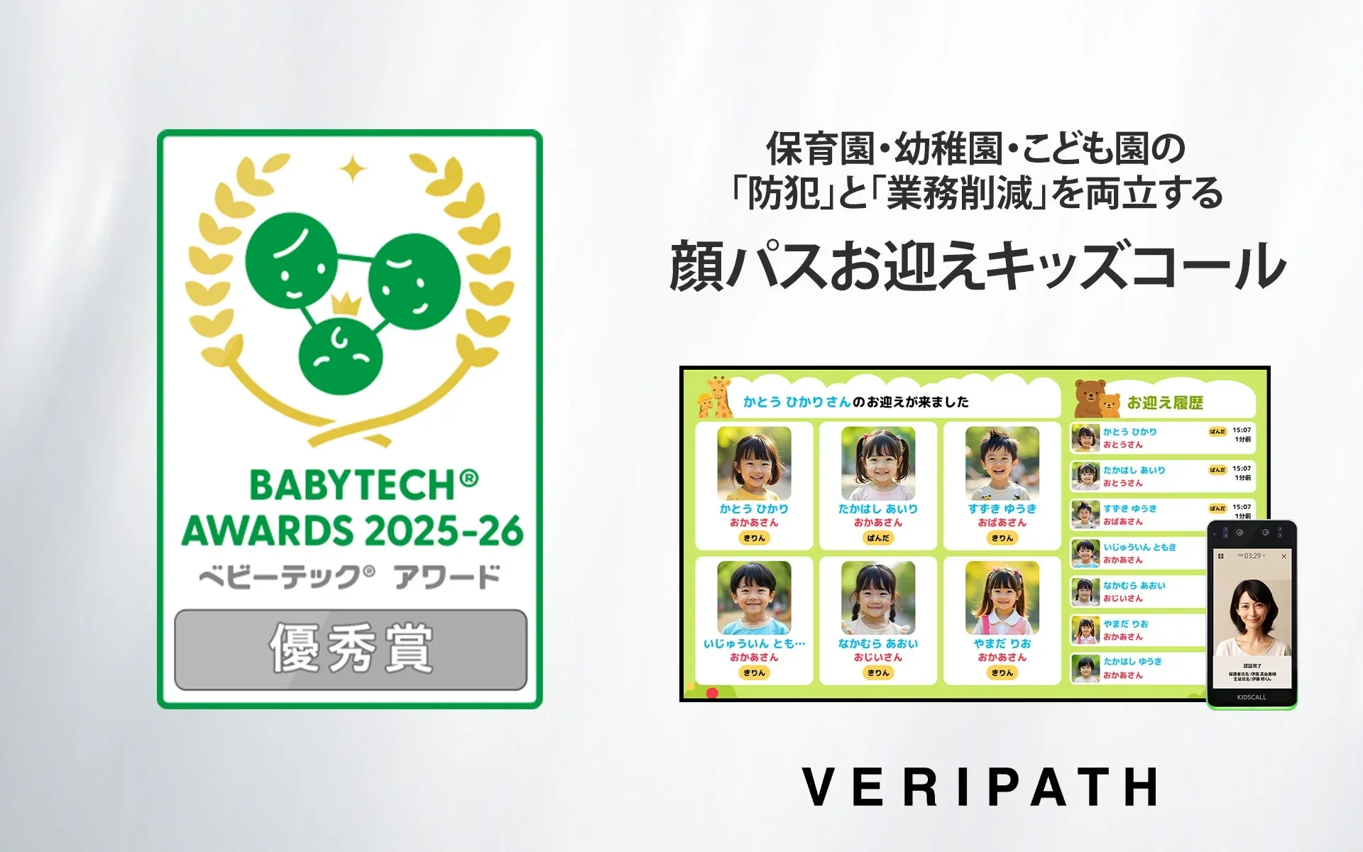 保育園・幼稚園・こども園で導入されている顔認証お迎えシステム『KIDSCALL(キッズコール)』が、日本最大級の保育テック表彰「BabyTech® Awards 2025-26」において、「保育ICT 保育中の事故防止部門 優秀賞」を受賞しました。
