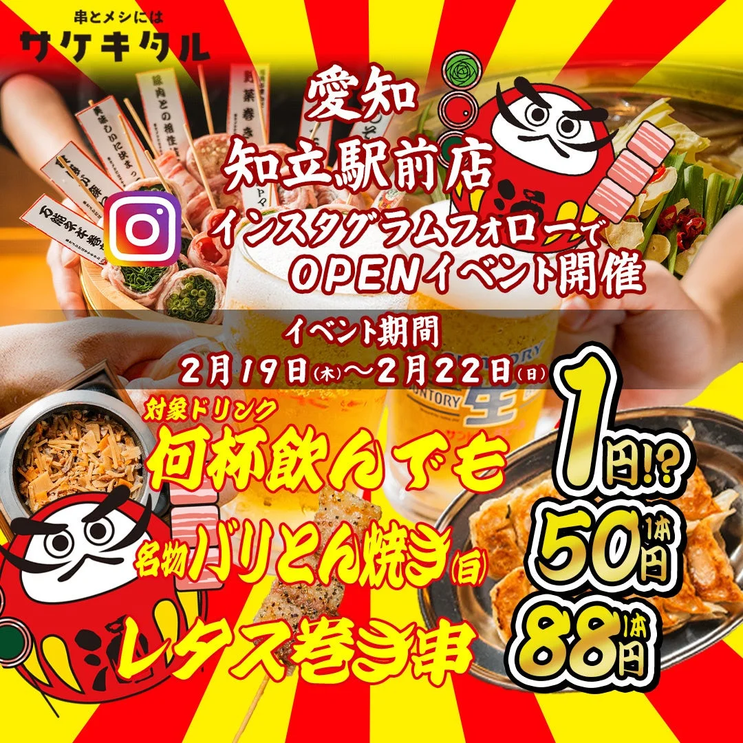 愛知県知立市に、新しいスタイルの居酒屋「串とメシにはサケキタル。知立駅前店」が2026年2月19日(木)にオープンしました。このオープンを記念して、期間限定のスペシャルイベントが開催されます。
