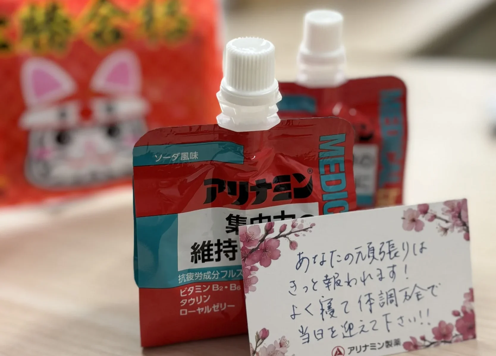 受験期は多くの学生にとって、心身ともに大きな負担がかかる時期です。アリナミン製薬は、この負担を少しでも軽減し、学生たちが安心して試験本番に臨めるよう、今回の支援を実施しました。