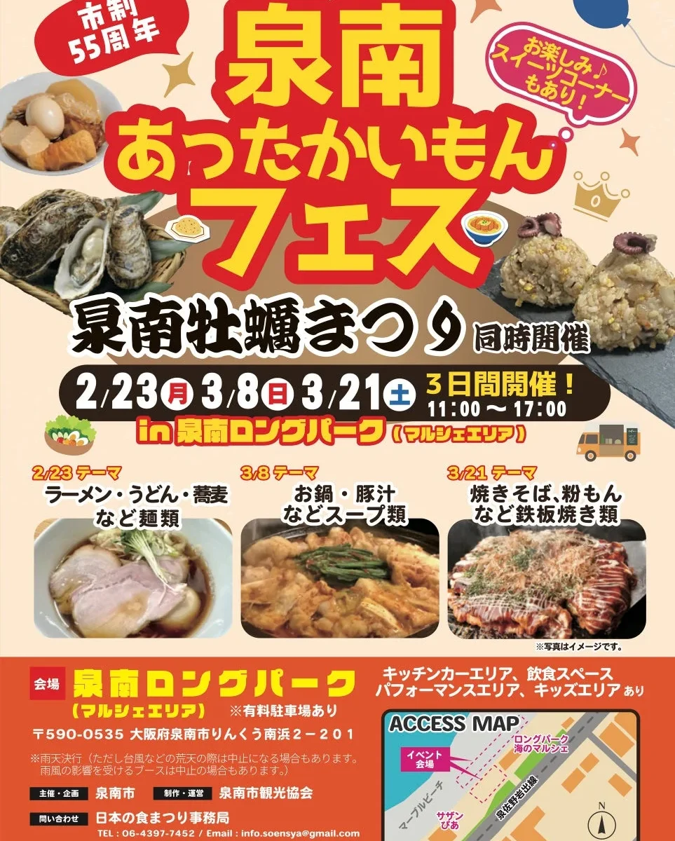 泉南市制55周年を記念して、冬のあったかグルメが楽しめる食イベント「泉南あったかいもんフェス」が開催されます!SENNAN LONG PARK(泉南ロングパーク)のマルシェエリアで、2026年2月23日(月)、3月8日(日)、3月21日(土)の3日間、各日11:00〜17:00に開催されますよ。
