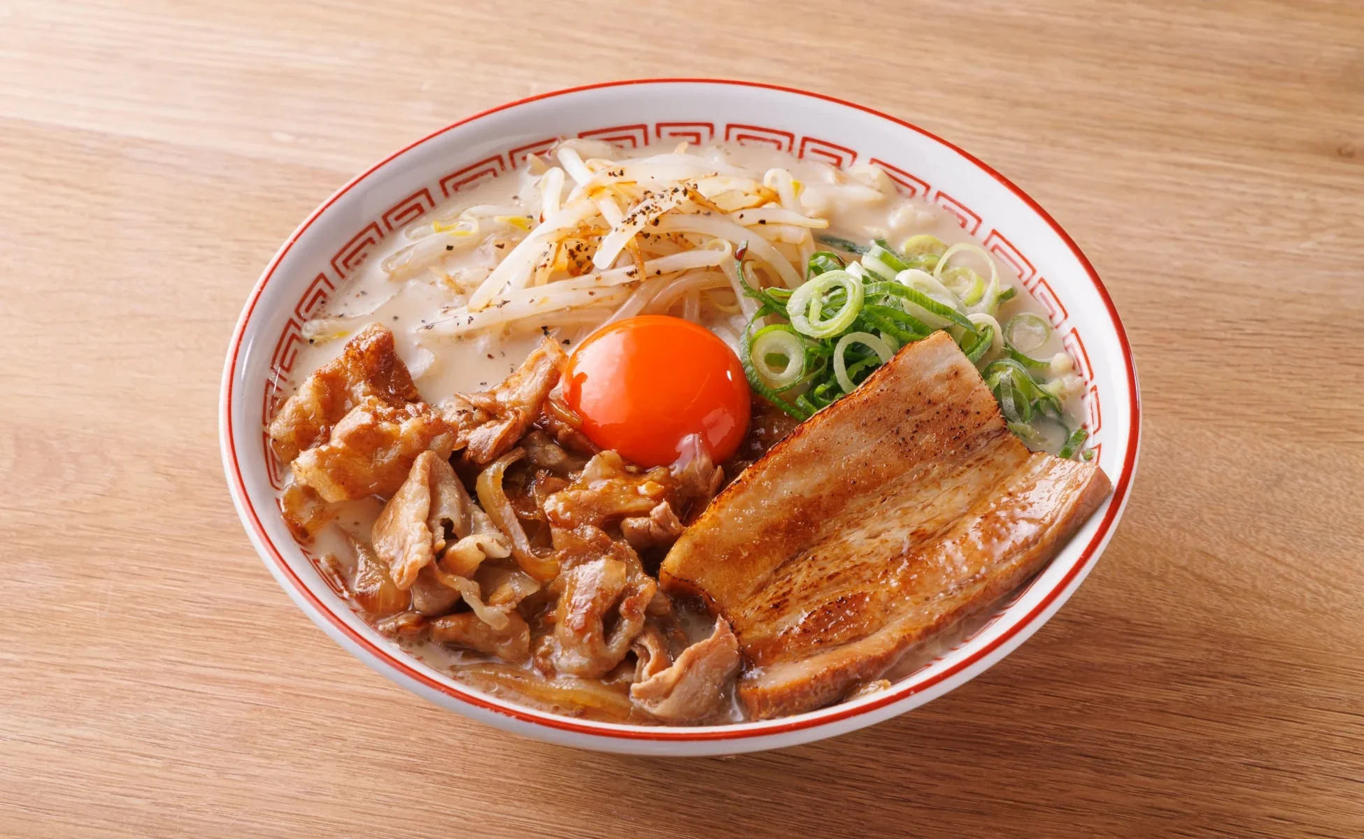 濃厚な豚骨スープに国産鶏ガラと野菜の旨みを重ねた特製ブレンドスープが特徴です。つるもち食感の特注麺に、豚大学秘伝のタレで焼き上げた豚肉が豪快にのせられ、中央にはとろ~りたまごが。濃厚な旨みを存分に楽しめる一杯です。