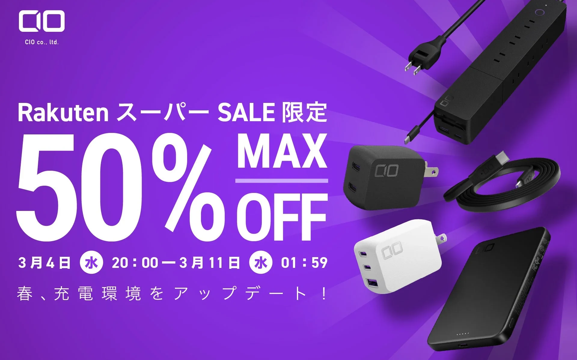 日本発のガジェットメーカー、株式会社CIOが「楽天スーパーセール」に登場!2026年3月4日(水)20:00から3月11日(水)01:59までの期間限定で、人気のガジェットが最大50%OFFで手に入ります。