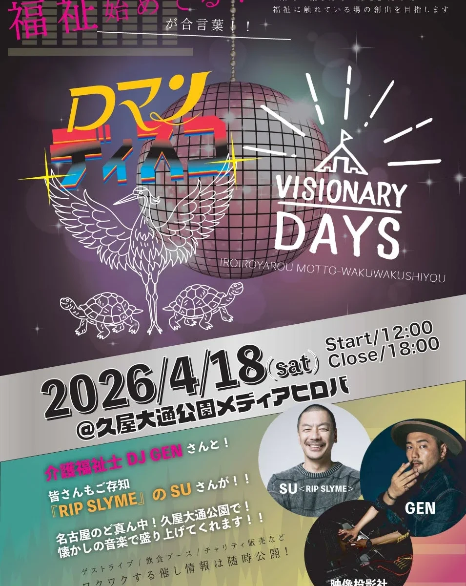 2026年4月18日(土)、名古屋市中区の久屋大通公園メディアヒロバが、一日限りのディスコ会場に大変身します!「福祉、はじめてる?」を合言葉に、大規模福祉イベント「VISIONARY DAYS」と「ロマンディスコ」がコラボレーションし、音楽を通じて福祉を身近に感じられる特別なイベントが開催されます。