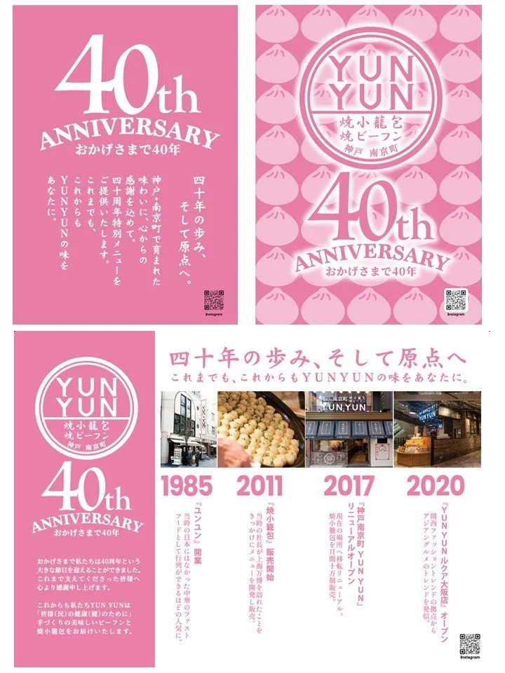 神戸・南京町で愛され続けるビーフンと焼小籠包の専門店「YUNYUN(ユンユン)」が、この度40周年を迎えました!長年のご愛顧に感謝を込めて、2026年3月8日(日)から3ヶ月間、月替わりの特別な「40周年記念・期間限定メニュー」が登場します。