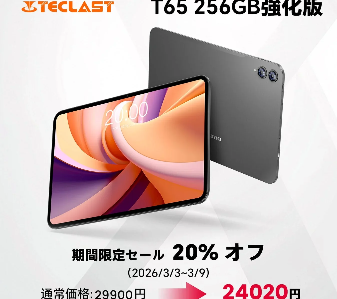 Teclastから、2026年強化版Android 16タブレット『T65 256GB』のAmazonセールが発表されました!2026年3月3日(火)から3月9日(月)までの期間限定で、この高性能タブレットが20%オフのお得な価格で手に入ります。