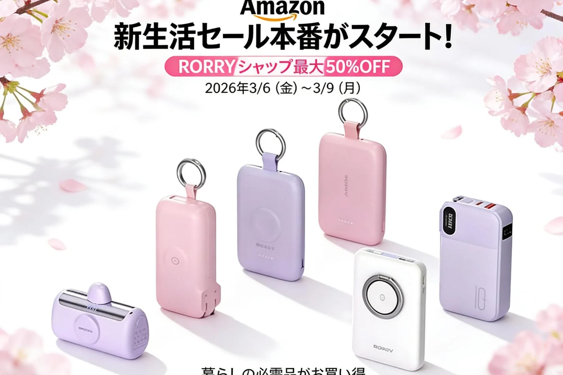 Amazonで「新生活セール本番」がスタートしました!2026年3月6日(金)から3月9日(水)までの期間、RORRYの公式Amazonストアでは、モバイルバッテリーや充電スタンドなど、20種類以上の人気アイテムが最大50%OFFの特別価格で販売されています。さらに、一部商品には追加で10%~20%OFFになるクーポンも配布中なので、この機会を見逃さないでくださいね!