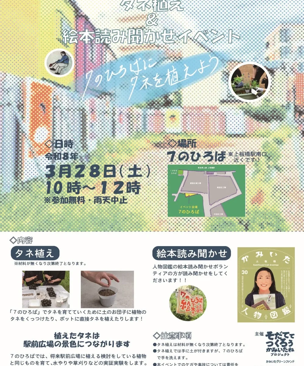上板橋駅南口駅前の「7のひろば」で、みんなで一緒に緑を育てる楽しいイベント「タネ植え&読み聞かせイベント」が開催されるよ!