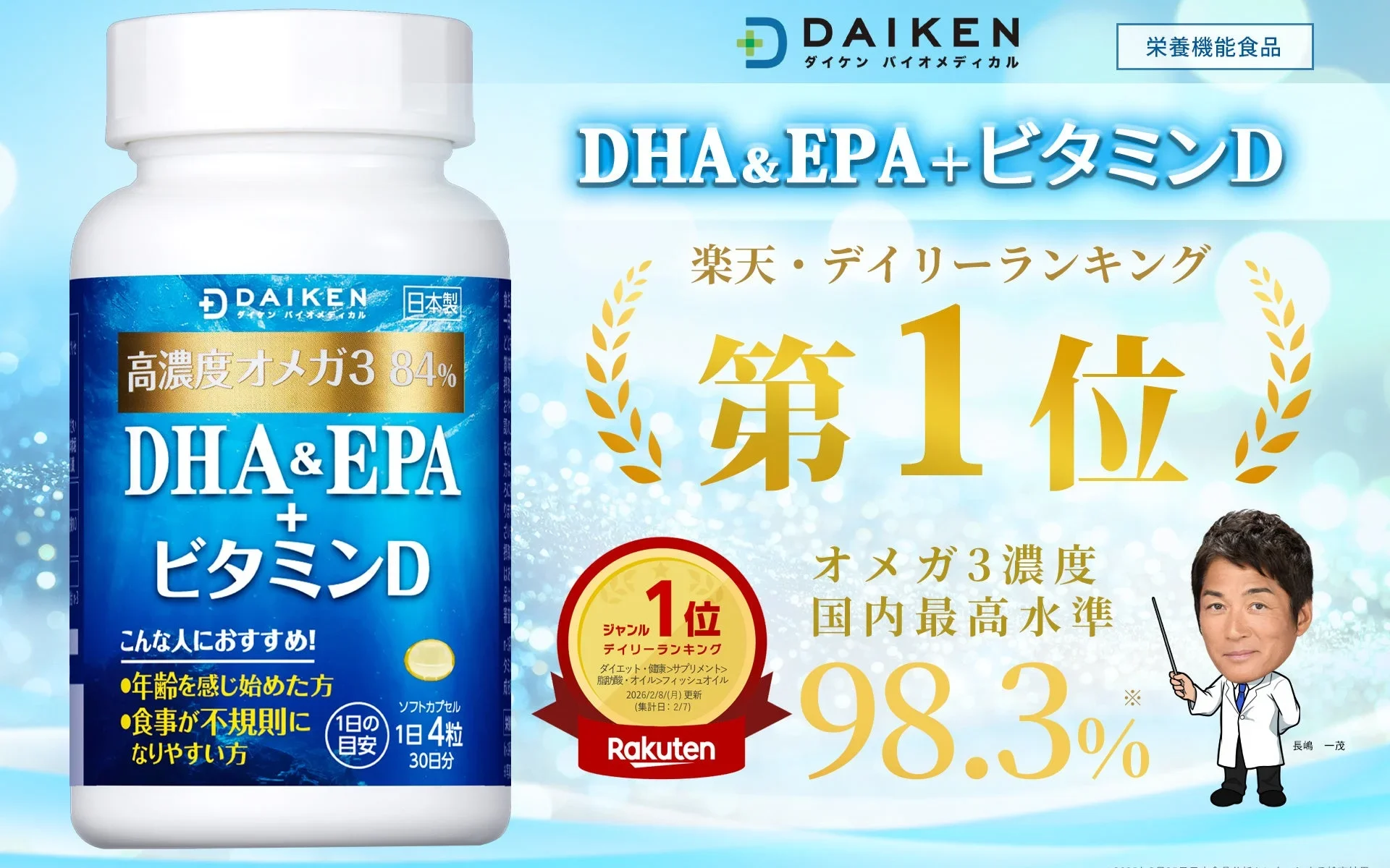 日々の健康を気遣う方々に朗報です!大研バイオメディカル株式会社から発売されている「DHA&EPA+ビタミンD」が、楽天市場の「ダイエット・健康 > サプリメント > 脂肪酸・オイル」カテゴリで、デイリーランキング第1位を獲得しました(2026年2月7日集計)。