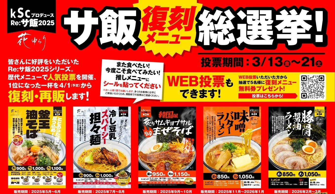 「Re:サ飯2025」シリーズでは、これまで個性豊かな5つのメニューが登場し、多くのお客様に好評でした。今回の人気投票では、その中から「もう一度食べたい!」という声が多かったメニューを復刻販売します。